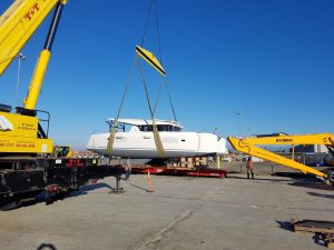 Here’s Fandango arriving from the factory. We were able to watch her progress on the cargo ship via the website MarineTraffic.com. If a boat has GPS, it’s trackable. In fact, if you’re interested in seeing where Fandango is now, just search Marine Traffic for her name. Look for the yacht in southern California, because there are quite a few other Fandangos out there! Later on I’ll be adding a tracker to this page to make finding us easy.